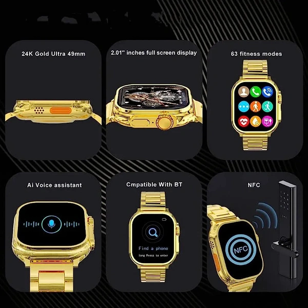 PunnkFunnk Smart Watch Golden, Golden Smartwatch for Men The Ultimate Companion Ultra Watch Golden Smartwatch - Golden Bracelet Strap - Bluetooth Call, Wireless Charging, Fitness Bracelet - Golden